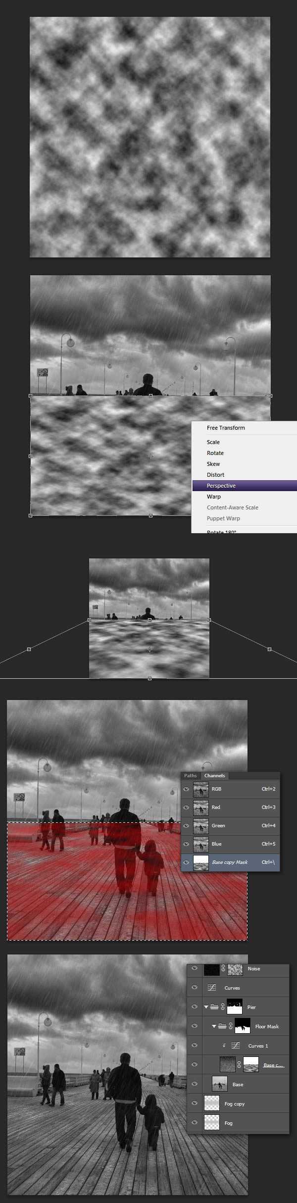 接下来,增加一个云的纹理来增加随机性。滤镜>渲染>云彩。CTRL + T压缩到地平线的位置。在自由变换模式下,右键单击选择透视。