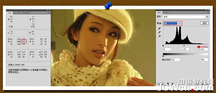 5、添加色阶调整图层,以1#取样点数值最高的R通道为准,分别调整G通道和B通道。具体方法是:将色阶面板上的G通道和B通道白色滑标向左拉,直到数值都达到223。