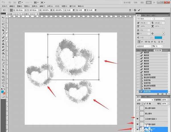4、Ctrl+J复制多两个爱心图层,Ctrl+T选中爱心拉伸缩小、旋转角度。