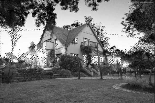 第7步:给原图1添加图层蒙板,选择适当不透明度的黑色画笔,对建筑物、草坪及周边环境进行擦除,掌握的尺度是,既要保留室内外灯光的效果,又要体现建筑物整体及周边环境的亮部细节。这一步需要耐心和细致。