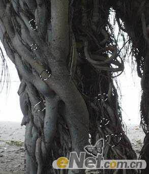 下面来添加结合部的碎裂效果。使用“快速选择工具”在树图片上选择几小块