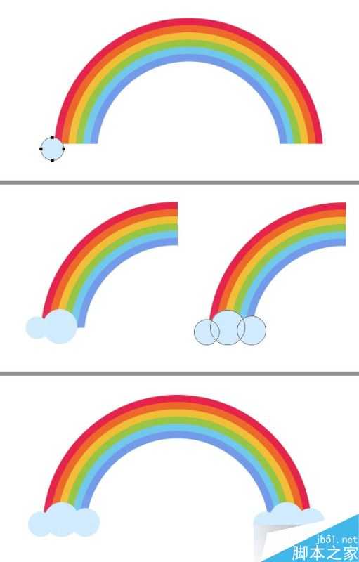 让我们在彩虹的两端弄两朵云。 使用椭圆工具(U)在彩虹的左下角画一个蓝色的小圆。 再添加几个的不同尺寸小圆。 按住(Control+G)把组成云彩的各个元素放到一组,并(Control+J)复制一组云。 放复制后的云朵放在彩虹的另一侧。