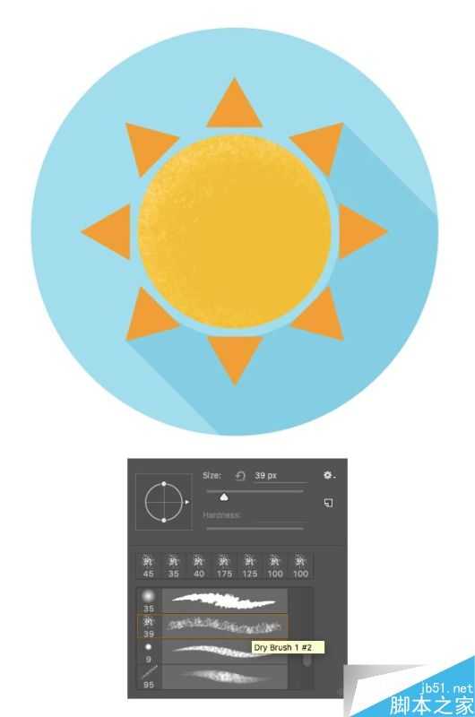 在颜色面板选择浅黄色,在太阳图层上层的剪贴蒙板图层,加一些柔和的锈迹纹理。 选用深黄色在太阳主体的底部稍微加一些阴影。