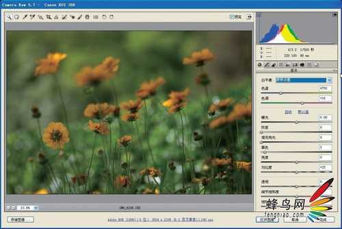 将照片导入到Ca m e r a R aw中,找到“曝光”调整滑块,将鼠标指针放置在滑块上,按住鼠标左键向右移动滑块,当数值显示到“+0.75”后松开鼠标。通过这一步操作,我们为照片增加了曝光,使得画面更加明亮,同时花丛的色彩也变得更加艳丽。通过Camera Raw界面右上方的直方图可以看出,调整前的色块集中在左侧,调整后的直方图则均匀地延展开。