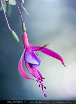 倒挂金钟花卉,垂落下来。我希望把花蕊的部分放置在亮部,让亮的背景去衬托花蕊。而花的亮部恰巧就处于圆亮光的区域部分,暗区部分是一个冷色调和花的暖色相间,所以在一幅作品之中,亮度、色彩、形态,三者互相作用。