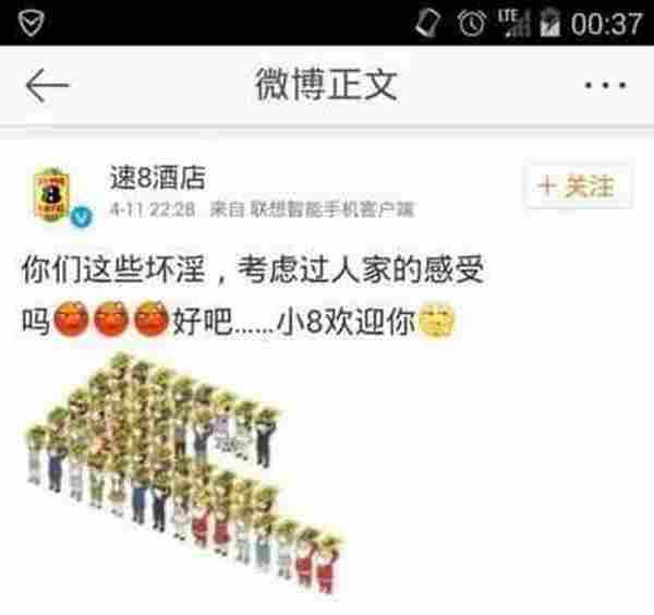这个话题越来越热,大叔估计@速8酒店的微博网友也越来越多,其官方微博终于在11日当晚发了一条微博,如下: