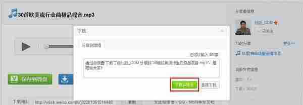 首先我们要找营销材料,营销材料必须保证材料本身具有传播价值,而且比较稀缺,最重要的是有一定用户群体的需求。所以我在微博上找到比较火的视频“30首欧美流行金曲极品混音”,这段视频当时在优酷已经有20多万的播放量(现在已经70多万了),在百度上搜索,发现有不少人要这个视频的MP3格式,当时我就使用Total Recorder软件把这部混音视频录制成MP3格式,并上传到微盘提供下载。