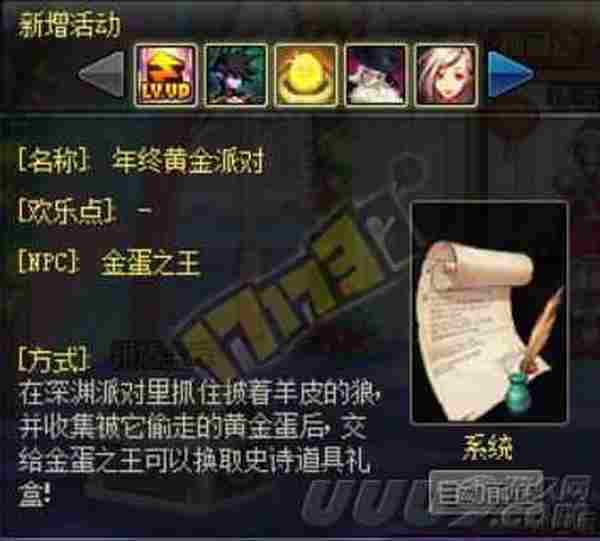 年终黄金派对活动期间在深渊派对中击败披着羊皮的狼后可以获得黄金蛋,可随机获得LV60~85的史诗武器、LV50~80的领主神器,可兑换深渊通行证、深渊邀请函、解除虚弱状态药