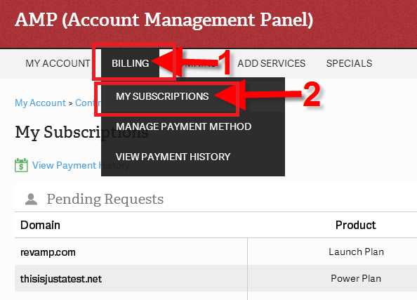 2、 在主菜单,将鼠标移动到“Billing”后选择“My Subscriptions”项,如图1所示;