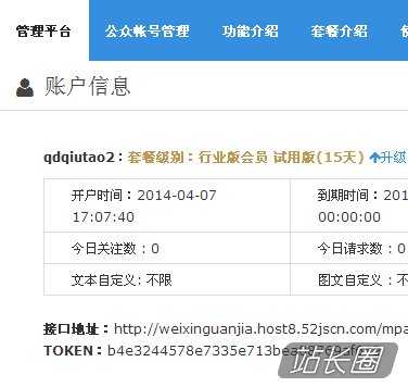 3.点击进入之后,弹出URL和Token填写框,这里一般程序或者平台都提供,这里以我们发布的微信管家为例,登录会员中心就可以看到URL和Token;