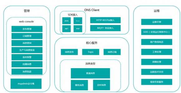 接入方面,阿里云ONS支持JAVA、C++、.NET、PHP四种语言的SDK接入,同时提供RESTful风格HTTP协议完成收发消息,另外还支持MQTT协议接入可以满足设备与设备、设备与应用间的可靠高效的通信。除了常规的延时消息,实现消息延迟投递,满足应用需要定时、延迟发送消息的需求外,依靠类XA的分布式事务架构,阿里云ONS还支持事务消息,能实现事务最终一致性。