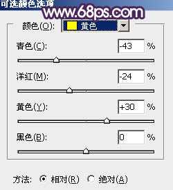 1、打开素材图片,创建可选颜色调整图层,对黄色,绿色进行调整,参数及效果如下图。这一步把图片中的黄绿色转为橙黄色。
