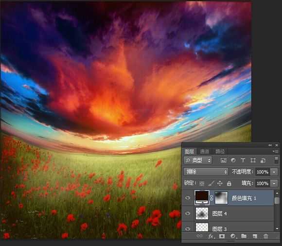 改变图层模式排除100%。在这个图层蒙版用黑色软刷不透明约15-20%擦除上方的天空,减少品红那里。
