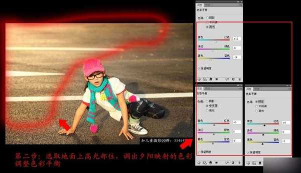 第二步:选取地面上高光的部分,用色彩平衡调出夕阳照射的效果。