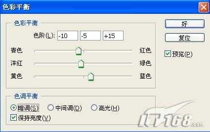 十、单击图层面板下方的“创建新的填充或调整图层”按钮,在弹出的快捷菜单中选“色彩平衡”命令,在弹出的对话框中选择阴影设置各项参数,如下。