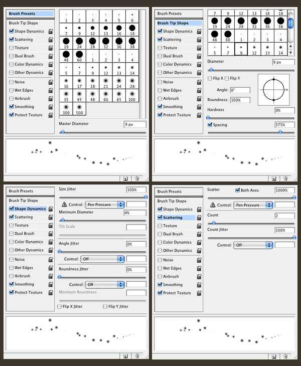 现在来创建一些灯光粒子,这里会用到Photoshop的画笔选项。新建一个图层,放置在刚才创建的light-effect的组中,将画笔颜色设为白色,按F5弹出Photoshop的画笔选项。选择一个一般的画笔,调节形状动态(shape Dynamics)、散布(Scattering)等选项,直到类似下图所示的画笔。