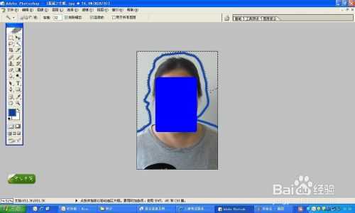 10、填涂完毕后反复检查至达到要求,然后用模糊工具勾画人物和背景的边缘线,以缩小至与屏幕匹配后达到要求为准,至此蓝底的二寸照片就制作完成。