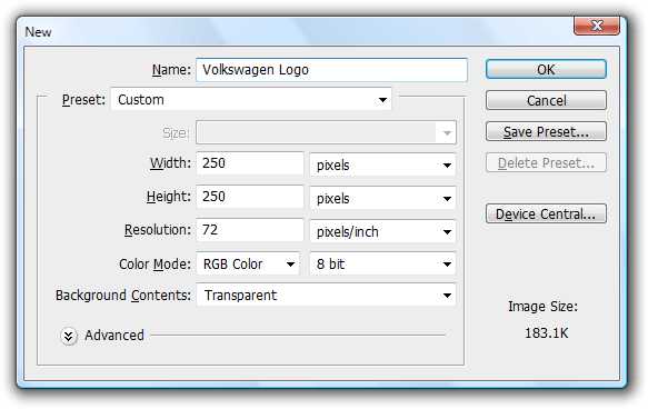 首先,我们在Phoptshop中执行 文件>新建 ,并创建一个250×250的新文件,使用下图的属性设置