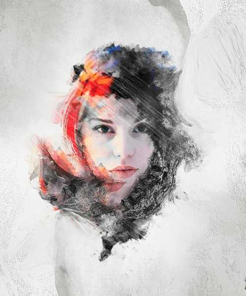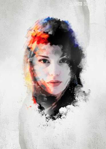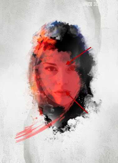 用任意的喷溅笔刷作为橡皮,将女孩图片的边缘像下图这样涂掉(注意图的时候调整笔刷大小)