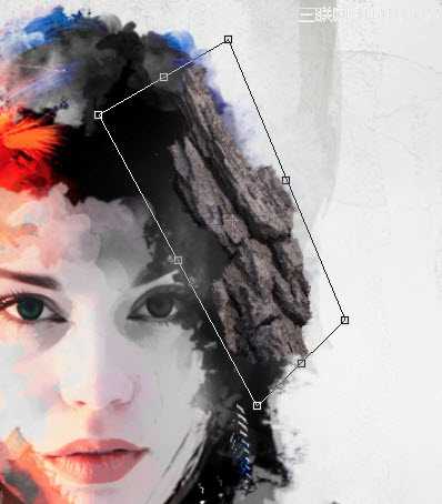 Step 3我们要在脸周围加一些树皮纹理——用快速选择工具在树皮图片上选取一块,然后复制粘贴到这个文件里,如下图: