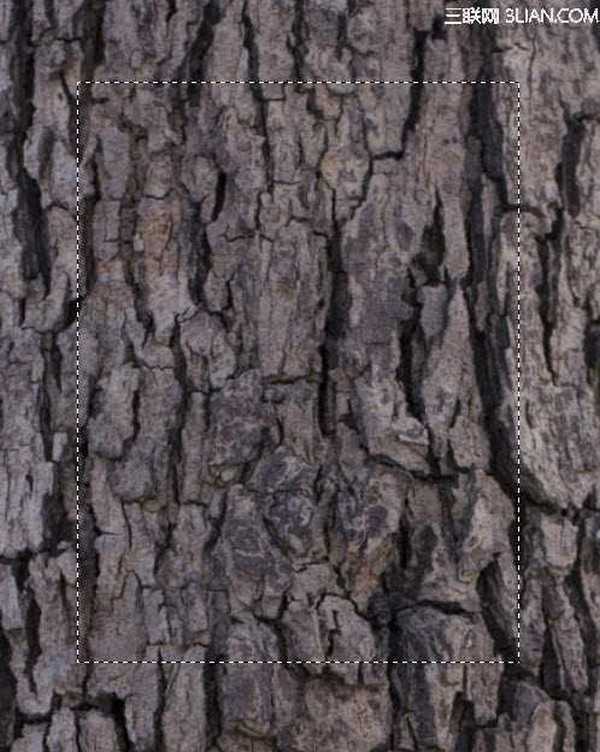 我们会在背景上加点纹理——载入树皮纹理,用矩形选框工具圈出一个选区,如下图