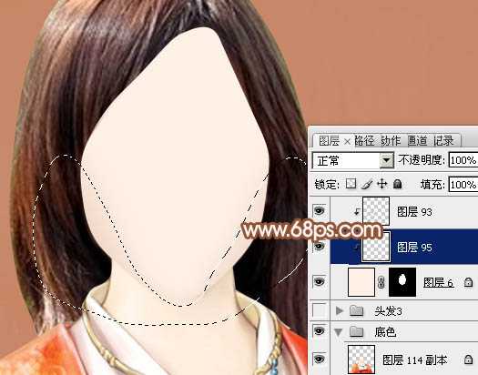 3、新建一个组,命名为“脸部”,在组里新建一个图层,用钢笔勾出人物脸部的轮廓,转为选区后填充淡黄色:#FEF0E5,然后看一下整体比例,如果不满意可以调整一下。这里的脸的轮廓需要简单优化一下,下巴稍微勾尖一点。
