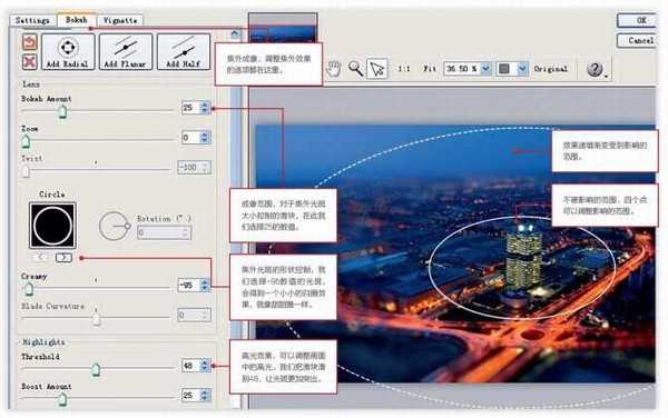 城市光污染让照片呈现脏脏的灰黄色,要修正颜色。立交桥和大楼在画面中最醒目,需加强表现。远景的楼房灯光闪烁,很适合我们使用Alien Skin Bokeh滤镜做出光斑效果。