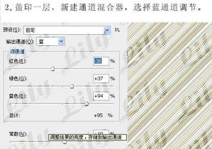 2、新建一个图层,按Ctrl + Alt + Shift + E 盖印图层,创建通道混合器调整图层,对蓝色进行调整,参数设置如下图。