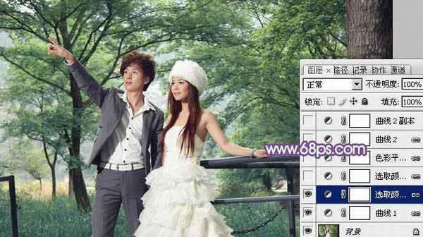 2、创建可选颜色调整图层,对绿色进行调整,参数及效果如下图。这一步个图片中的绿色转为青绿色。