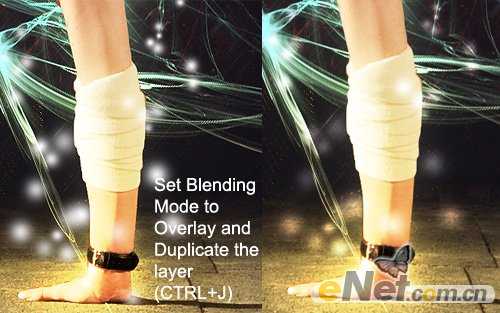 5.添加更多的光,在所有层的上方新建一个图层,选择画笔工具,并选择一个大的柔角笔刷,在腿部绘制蓝色颜色,