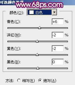 6、创建可选颜色调整图层,对黄、白、中性、黑进行调整,参数设置如图15 - 18,效果如图19。这一步增加高光部分的橙黄色。