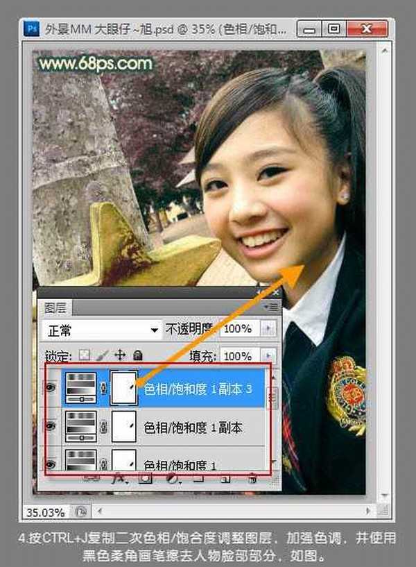 4、按Ctrl + J 复制两次色相/饱和度调整图层,加强色调。并使用黑色柔角画笔擦去人物脸部部分,如下图。