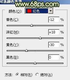 2、再创建可选颜色调整图层,对红、黄、绿进行调整,参数设置如图5 - 7,效果如图8。这一步微调橙红色部分,稍微增加一些褐色。