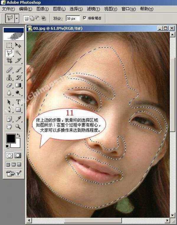 大致过程:我们用选区工具如套索及钢笔工具等把需要磨皮的部分选取出来,适当羽化选区后执行高斯模糊,这样就可以消除脸部及皮肤上的噪点。后期再用模糊工具涂掉其它部分的噪点即可。这个方法对局部磨皮是非常快捷的。