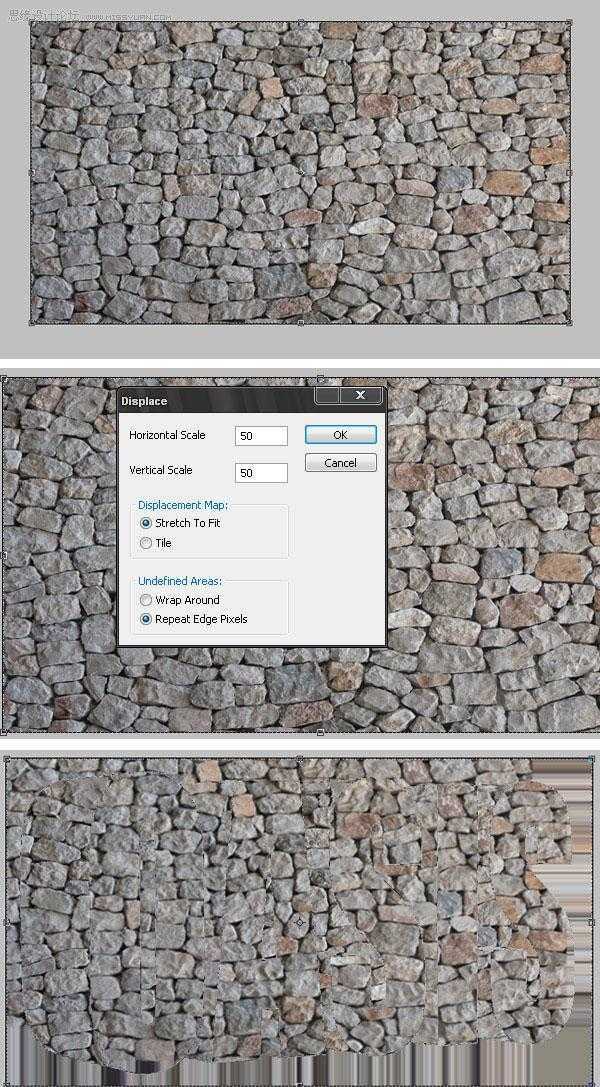 现在我们要添加一些“泥土”。再一次打开“替换纹理”文件。粘贴这个到一个新层中。去滤镜>扭曲>替换,寻找“map.psd”,设置水平和垂直方向的值均为50。然后选择全部(Ctrl + A 或 Command + A),复制选区。(这步看着很眼熟吧~参照步骤5,后几步也是一样的~)