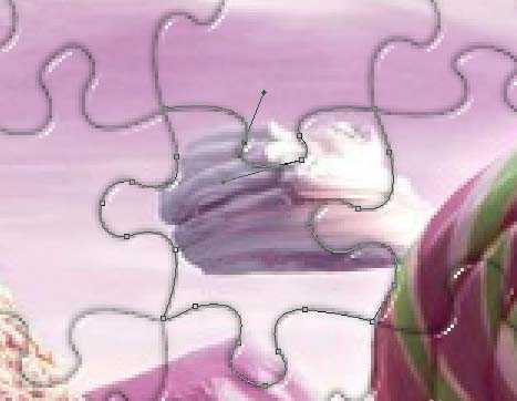 7、选择图层1,钢笔工具再次沿着另一块拼图的边缘绘制路径,并将该路径转换成选区。然后按Delete,将这块拼图删掉。