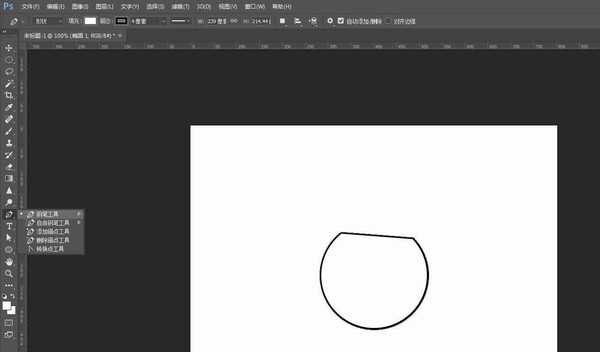 从工具栏找到“钢笔工具”,或者使用快捷键P,勾出一个形状,填充白色,加上黑色描边