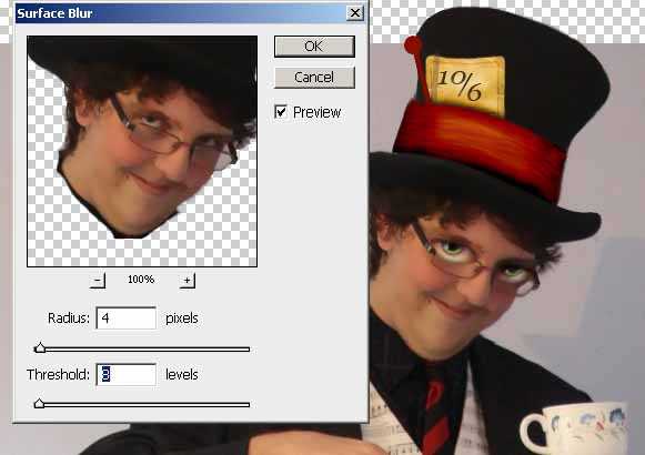 另一件事情我必须调节眼睛。下载带有帽匠和作物的眼睛大尺寸图像。创建每只眼睛的图层并将其放置在正确的位置。使用模糊工具软化的边缘。 就像在任何其它混合过程中,你需要慢慢地工作,并采取每一细节的照顾。