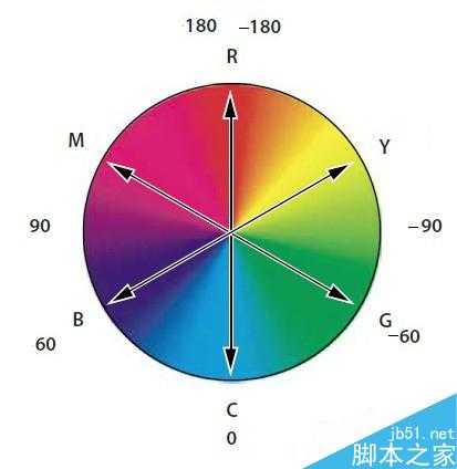 在学习之前,大家有必要先认识一下下面的图片。里面的RGB,CMY.就不多说了。这张图里的数字是经过我改过的,主要就是为了方便大家理解。是为了和色相调节相匹配。这里的数值相当于色相的数值。-180——0——180.和这张图的角度相对应。这张图可以看成每两个颜色之间相差60度。
