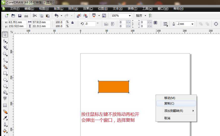 按住鼠标右键不放拖动再松开,会弹出一个窗口,选择复制,可把选中的对象复制到工作区内任意地方