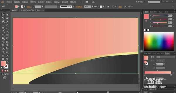3、继续画出天空所在的路径,我们设置粉红色的渐变填充天空的路径,让其位于所有元素的最底层。在图片左侧画出树丛的路径并用绿色的渐变填充。
