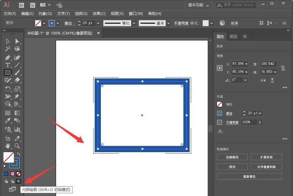 2、接着我们在左下角切换到内部画图,这时候矩形的视角会显示参考线;