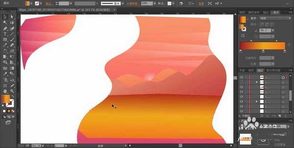 4、这一步,我们用火红色的渐变与暗红色的渐变搭配填充远山与近处的山峰,让山的形状呈现在波浪的中间位置。