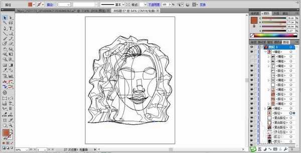 1、先用钢笔画出姑娘的头发的轮廓与细节,让多导次的头发路径呈现出来。我们用灰黑色填充头发的主体,用多明度的火红色的渐变填充头发的其它细节路径,并在明度上稍稍变化。