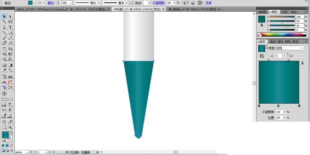 7、最后,我们用钢笔与圆形画出圆珠笔的笔头并填充青色的渐变,整个圆珠笔的设计完成。