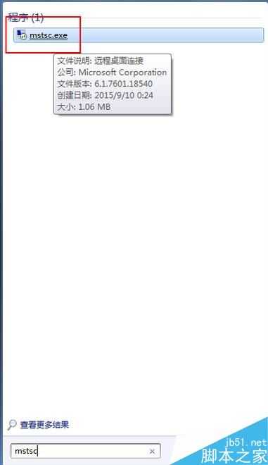 点击桌面左下角的开始按钮,在搜索程序和文件框中输入“mstsc”,也可以点击开始-运行,在命令框里输入“mstsc”。