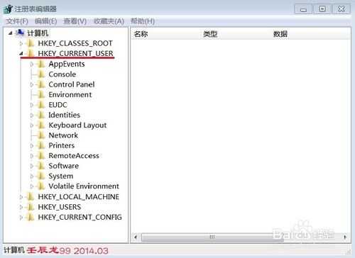在打开的“注册表编辑器”中找到:HKEY_CURRENT_USER,并点击:HKEY_CURRENT_USER前面的小三角;