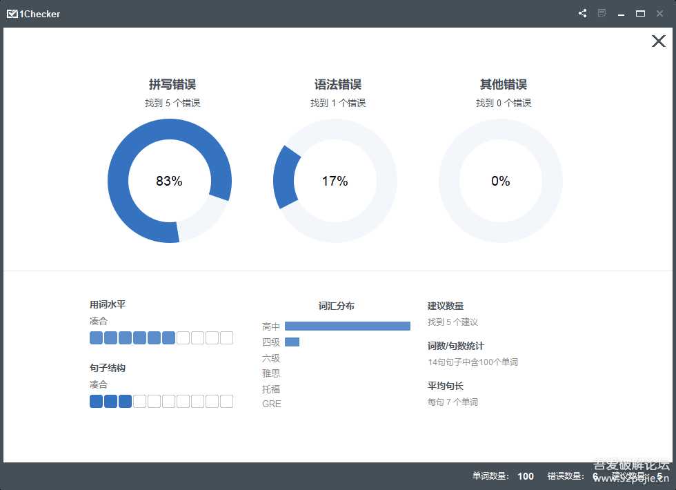1Checker是一款中文本土用于进行英语文本的纠错(包括拼写、语法、样式和句子不完整)和润色的软件,界面是中文的,简单易懂,操作方便。其兼容性非常好,无论是Windows还是Mac它都可以轻松驾驭。同时,它操作界面非常友好,一键操作上手快,用来修改文章省时省力。