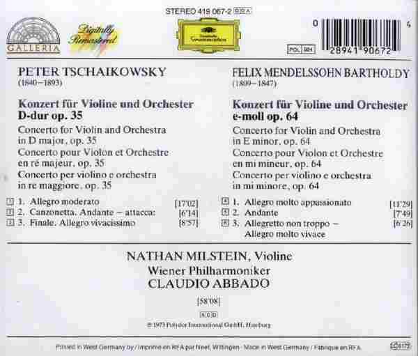 这张专辑是米尔斯坦与阿巴多指挥的维也纳爱乐乐团合作,演奏柴科夫斯基、门德尔松的《小提琴协奏曲》。