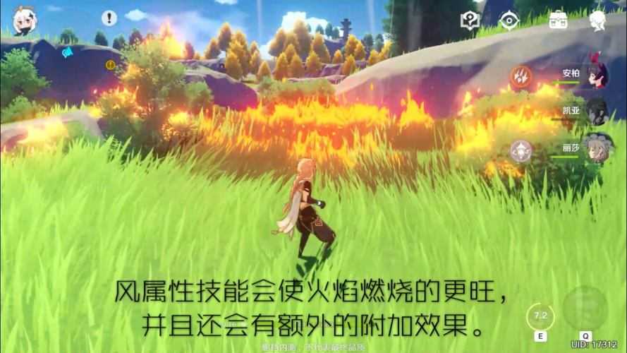 在原神这款游戏中,一共有七种元素属性,不同元素间的碰撞都会产生不同的效果,就以我们现在的四位初始角色来说——主角的技能是风属性,另外三位则依次是火 冰 雷。